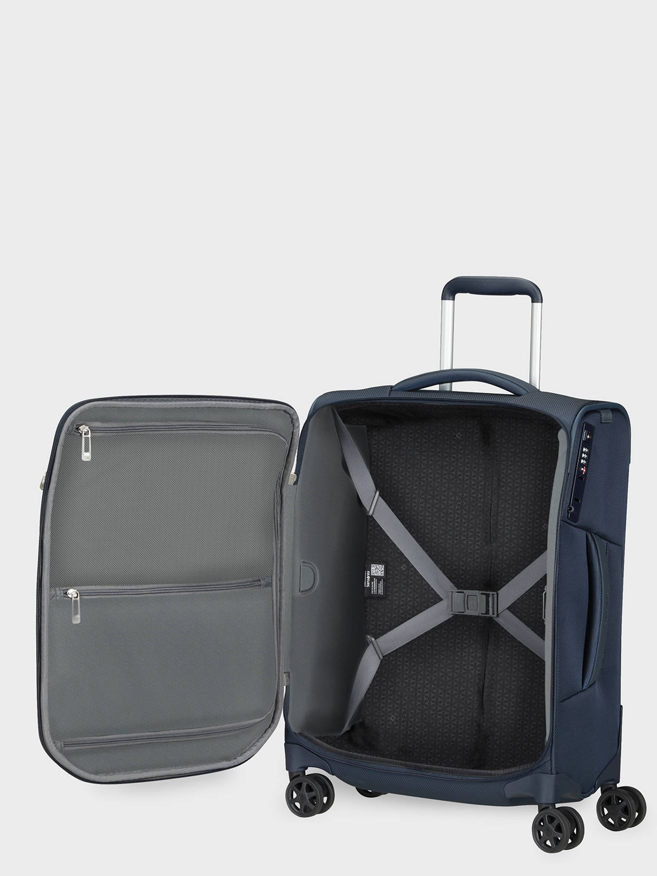 The Samsonite cabin suitcase is made from recycled polyester, making it an eco-friendly choice. It measures 20 cm in length, 18 cm in depth, and 55 cm in height, making it ideal for use as carry-on luggage when traveling by plane. It features two front pockets to easily store small items you want to keep within reach. To ensure the security of your belongings, the suitcase is equipped with a TSA code lock. It also has a telescopic handle for easy transportation. Inside, you will find two zippered pockets to store your personal belongings. The interior lining is also made of polyester for better protection of your belongings.