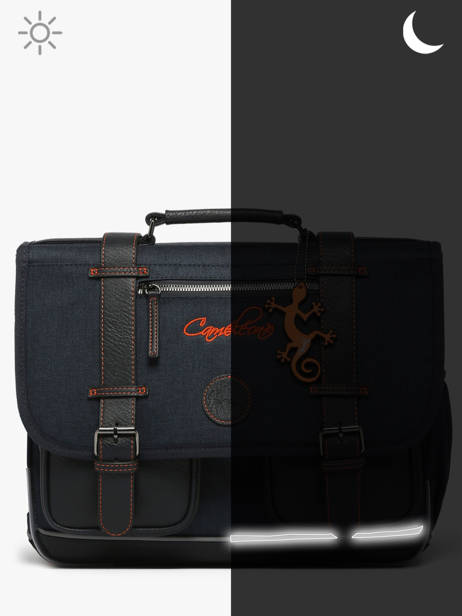 35 cm - 12 litres - 1 kg ~ Cartable enfant cp 35cm de la ligne Vintage Urban signé Caméléon, parfait pour le CP et la maternelle ! Il dispose de deux compartiments séparés par une poche centrale zippée. Vous pourrez y ranger les cahiers formats 21x29,7 et 24x32cm. Ce cartable 35 cm est doté d'un emplacement spécial règle et d'un emplacement pour la gourde. Il se ferme à l'aide d'un rabat et de deux fermoirs, et possède deux petites poches à fermeture éclair sur le devant, pratique pour le goûter. Petit plus, le cartable dispose d'une étiquette nom. Très confortable, le dos et les bretelles sont rembourrés. Pour ne pas abîmer les affaires d'école, le fond du cartable est renforcé. Côté sécurité, des bandes réfléchissantes sont disposées autour du sac. Petit plus, la règle Caméléon est offerte ! Fabriqué en polyester recyclé imperméable.
