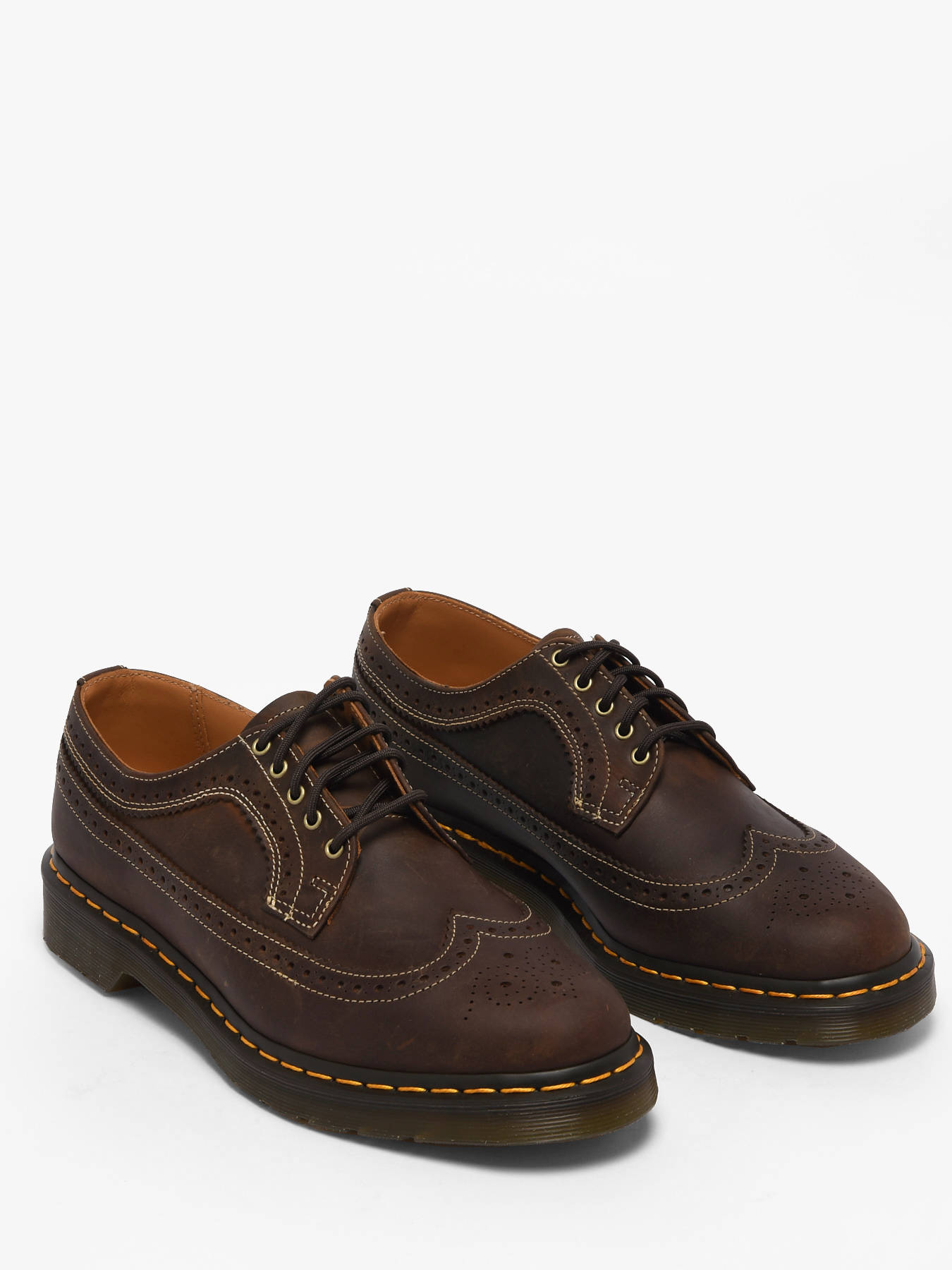 Les chaussures richelieus 3989 de Dr Martens en cuir Crazy Horse marron foncé allient tradition et caractère pour un style affirmé au quotidien. Le cuir épais texturé, sublimé par les éraflures et marques naturelles, se patine avec le temps pour révéler un look unique, tandis que les détails richelieus et les coutures contrastantes soulignent l’élégance distinctive du modèle. La semelle Doc’s renforcée avec surpiqûres jaunes assure robustesse et confort, complétée par des finitions dorées vieillies et des lacets ton sur ton pour un rendu raffiné et authentique. Polyvalentes et intemporelles, ces richelieus deviennent un incontournable pour ceux qui veulent traverser la journée avec style, assurance et la signature emblématique Dr Martens.