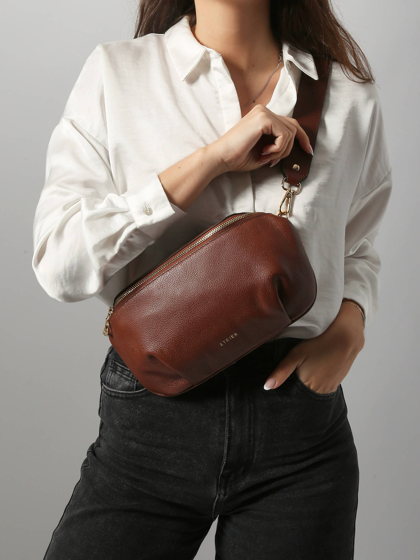 Le maxi sac banane ETRIER de la ligne TRADITION s'orne d'accessoires en métal doré et se décline cette saison dans des coloris tendance. Confectionné en cuir de vachette, il dispose d'une poche arrière et se ferme par une fermeture éclair. La large bandoulière amovible et réglable en cuir offre un porté en bandoulière. L'intérieur spacieux comprend un compartiment avec une poche zippée et deux poches plaquées pour une organisation optimale.