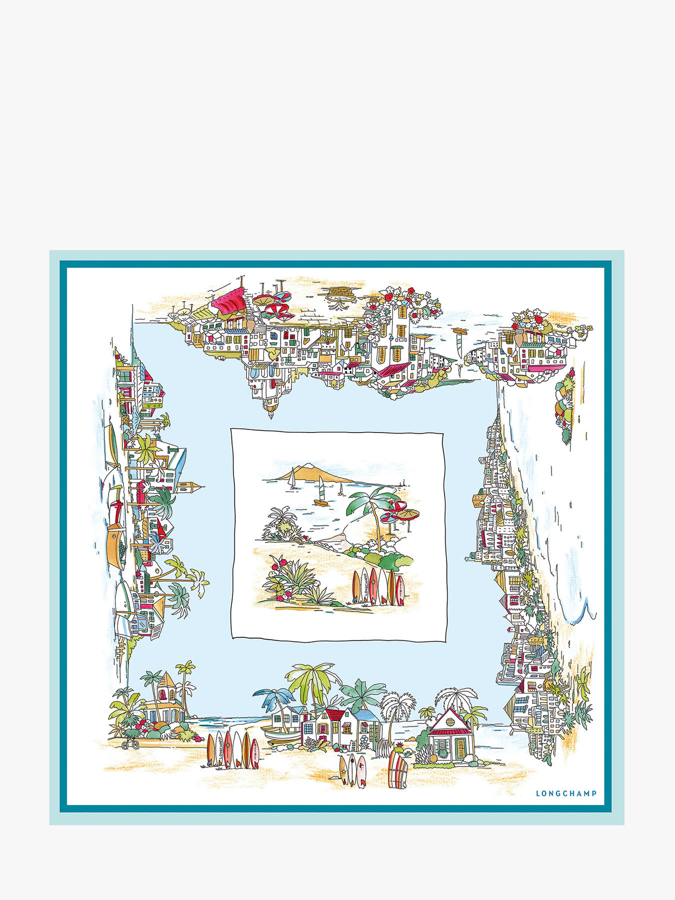 The LONGCHAMP 70 Vivement l'Été silk scarf, crafted from precious silk, captures the essence of summer holidays with a lively and joyful print. This design reveals a sunny landscape where the iconic Longchamp surfboards line a lively beach surrounded by palm trees, colorful parasols, charming beach huts, boats, and gently floating sails. The golden sand beautifully contrasts with the azure sea, inviting you to fully embrace summer in a relaxed and festive atmosphere. This silk scarf is the perfect accessory to add freshness and cheerfulness to your summer outfits.